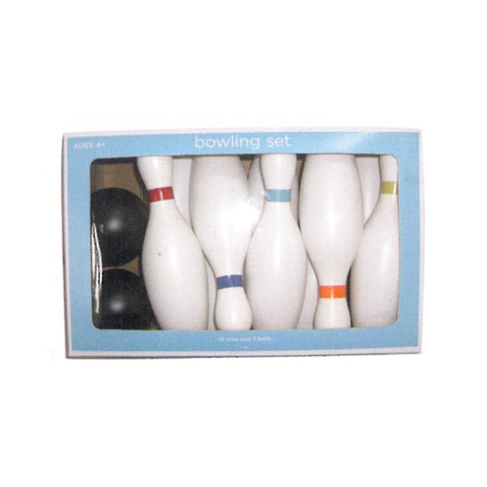 This is a toy bowling set with ten bowling pins and two plastic balls. This toy set is made of quality materials for a long service life. This interesting toy bowling set will bring endless fun to your little kids.