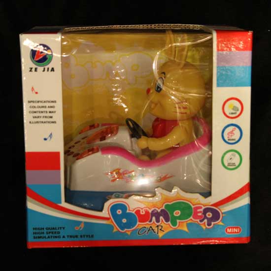 Pictured is a toy bumper car operated with three AA batteries. The car looks amusing as it is driven by a lovable rabbit driver. It thrills your kid with an ability to glide on solid surfaces at a high speed.