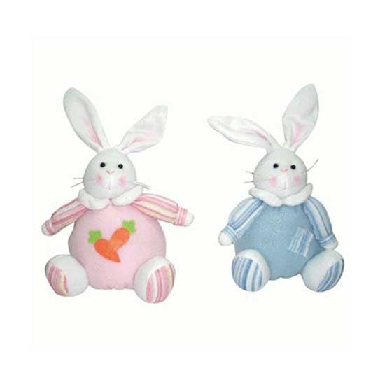 These two toy bunnies are dressed with striped clothes. They look at you with pleasant smiley faces with lovable rosy cheeks. Their puffy construction makes them comfortable for children to cuddle.