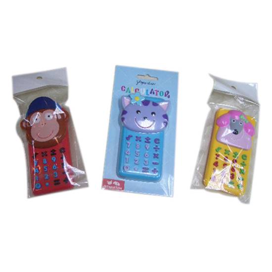 The toy calculator is packed in a plastic bag. It has cartoon animal on top of the calculator. It has coloured keypad.