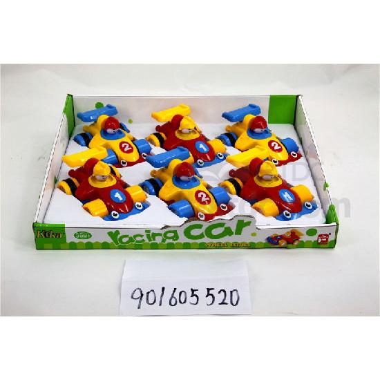 - Set of six friction toy racecars in cartoonish designs.