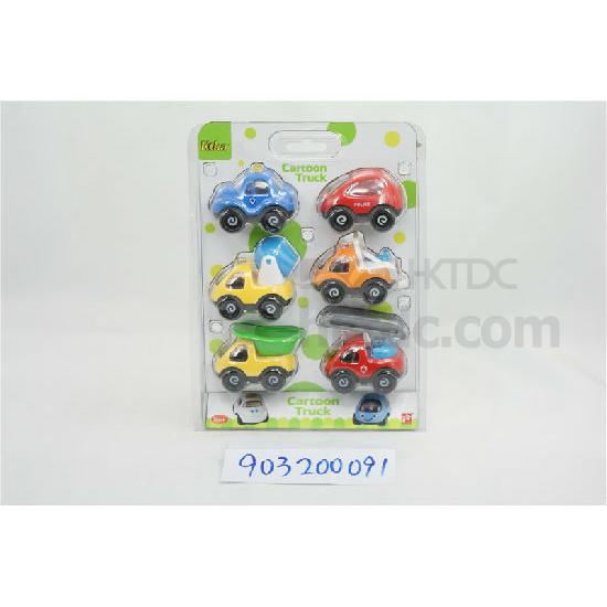 Displayed here is a set of toy cars with free wheels for smooth moving. The cars have colorful bodies and are printed with cute cartoon faces in the front. They come in compact sizes to fit nicely in the hands of children and are excellent for children to take outdoors to play.