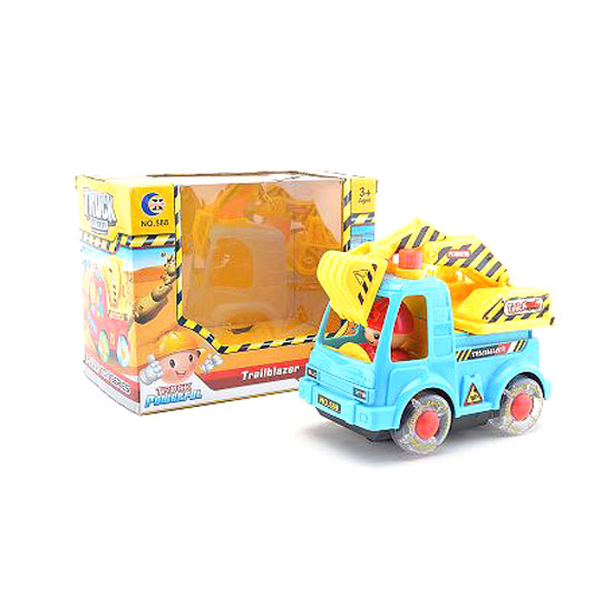 This is a toy construction car with a cartoon figure. It is designed in bright blue and yellow for an eye-catching look. This interesting toy car offers hours of fun for your little kids.