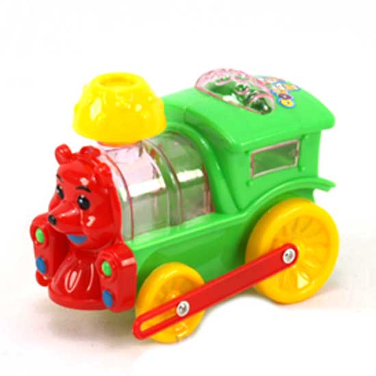 This toy cartoon locomotive comes in vivid colors for strong appeal. The partially opaque and transparent toy features a lovely bear's face on the front. It offers hours of great fun to a kid.
