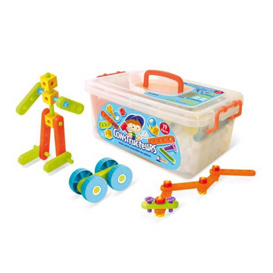 This is a set of toy construction blocks coming with all kinds of parts. There are wheels, joints, cubes, bars and so on, for children to build anything they want. A plastic box is provided for children to keep the blocks in order.
