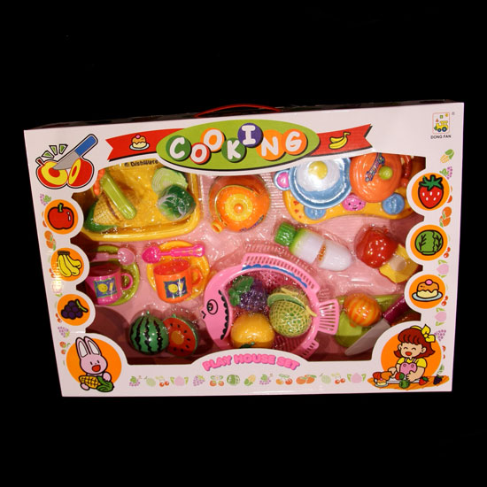 Featured here is a fancy toy cooking set that comprises toy food and beverage of various types. Tableware and cooking utensils are also included. Players can set up their own restaurants at home and serve guests.