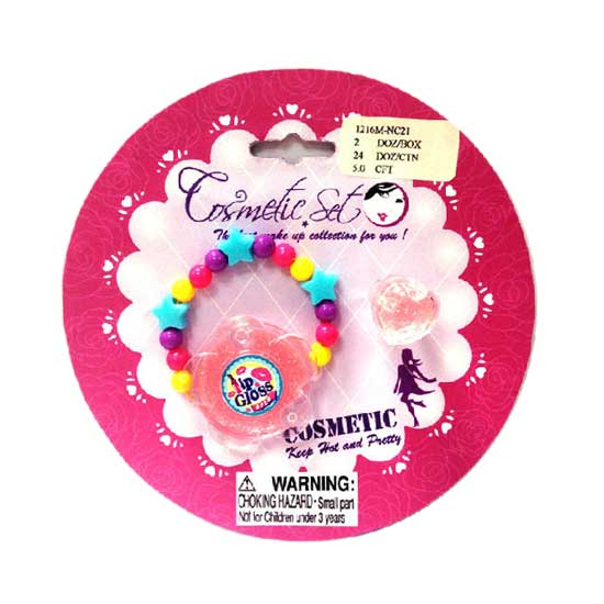 This is a toy cosmetic set that is designed for little kids. It is finely made with a fancy bracelet, a heart ring and glittering lip gloss. This toy cosmetic set is made of quality materials for a long service life.