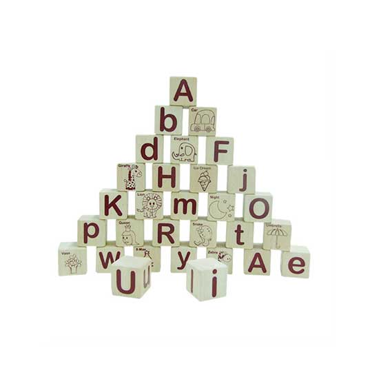 This is a lovely set of 30 blocks, 26 of which individually represent the letters of the alphabet. Each of these blocks features a capital letter, a small letter, and two pictures of words beginning with that letter. The 4 remaining blocks have extra vowels which can be used in combination with the other blocks to form simple words.