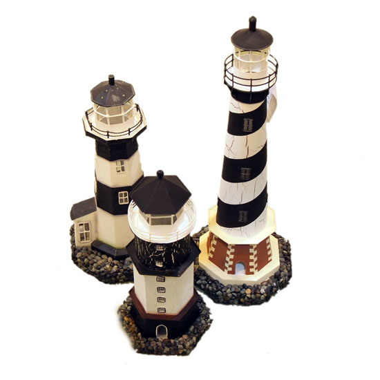 The lighthouse decoration is made out of tin. It is crafted with attention to detail to create a lifelike appearance. The decoration is available in assorted designs for selection.
