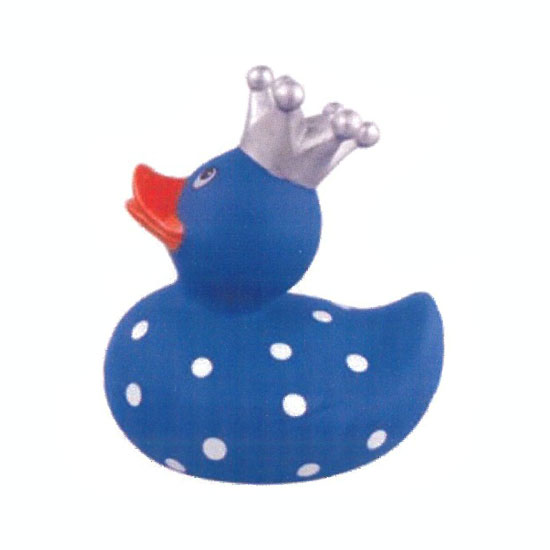 This is a toy duck made of plastic. With dotted patterns, this toy duck is decorated with a silvery crown for a fun look. This high quality toy duck is durable and fun to play with.