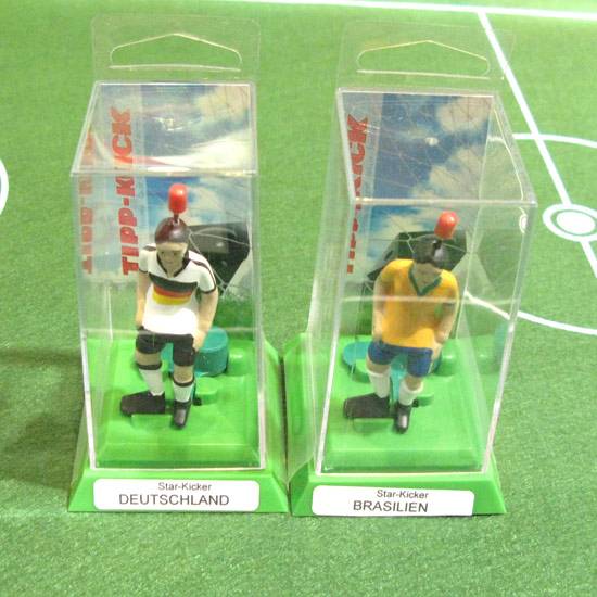 These are two toy football players as substitutes for star-kickers of TIPP-KICK Junior Cup. The left one is from Deutschland and the right is from Brazil. They are made of metal and are both hand-painted.