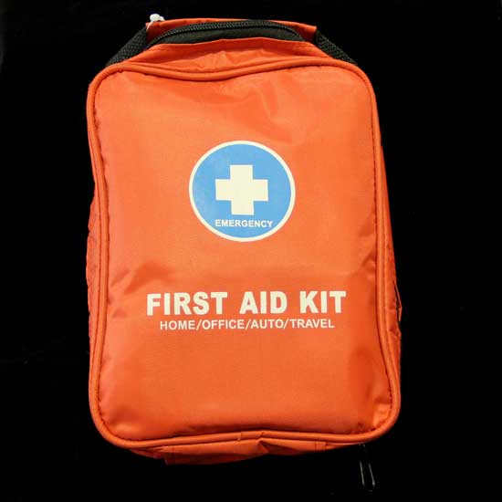 The picture displays a compact first aid kit bag in a bright orange color. The kit features well organized inner compartments for all the first aid essentials. The kit is not only a good medical toy for kids, but also perfect for your home, vehicle, and travel.