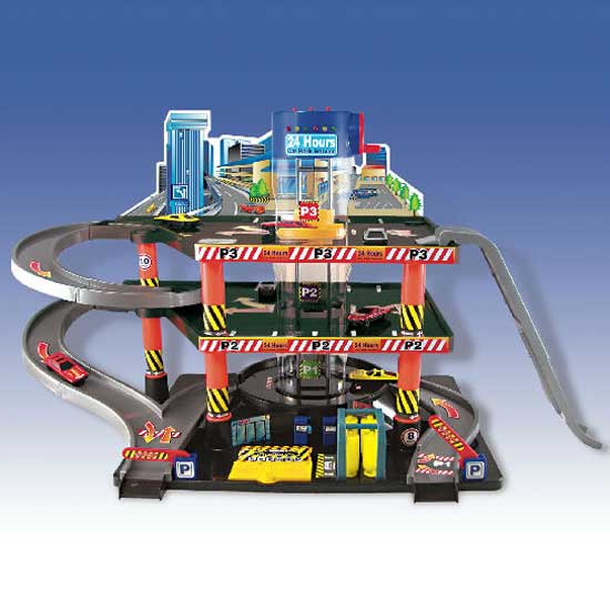 Displayed is a toy garage that comes with multiple accessories. Designed in a realistic manner, this toy garage has toy cars, spiral passways and a lift. This toy garage is easy to assemble and fun to play with.