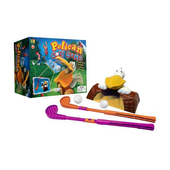 Displayed is a toy golf game that comes with a lovely cartoon pelican tree hole. Simply strike the ball into the tree hole to score. This game is easy to play and is a good choice for families.