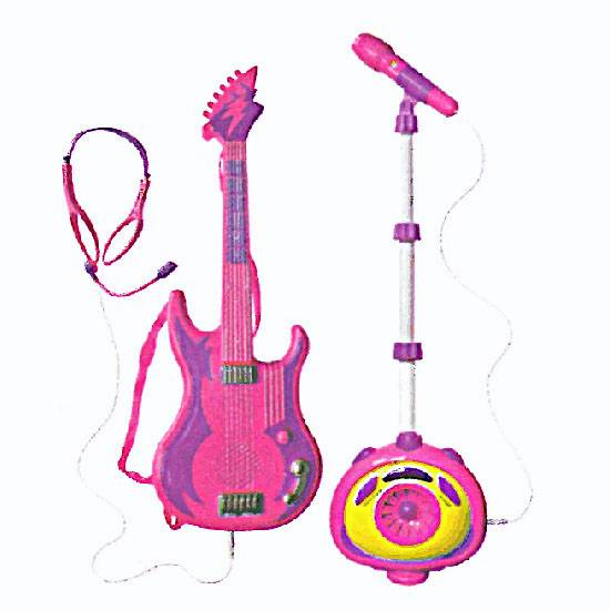 This is a set of toy musical instruments including an electric guitar, a headset and a microphone stand. The sharp pink color makes this instrument set attractive to girls. Let your girls invite their little friends over and hold a mini concert together.