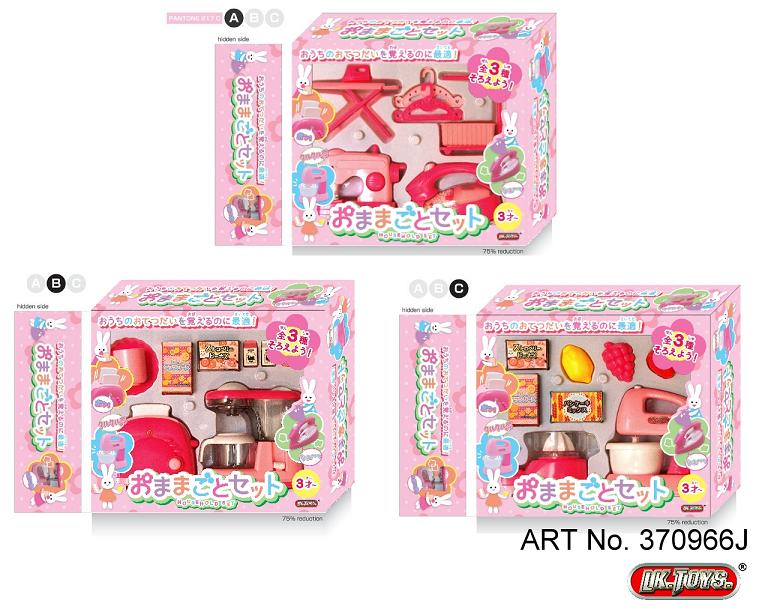 • This is a toy household set that comes in three styles. Powered by battery, the toys can function smoothly and safely. This fun toy household set is great for kids.
