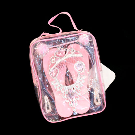 This is a set of kids' jewelry set with an eye-catching and stunning design. It comes with a pair of flip-flops, a necklace, a crown and other accessories. Well packaged in a light pink bag, this set surely is a great choice as a gift for girls.