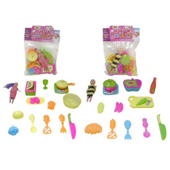 This toy kitchen set features a doll with assorted kitchen appliances and utensils. Girls can have great fun preparing various delicacies with friends. The clear bag packaging allows consumers to see the contents easily.