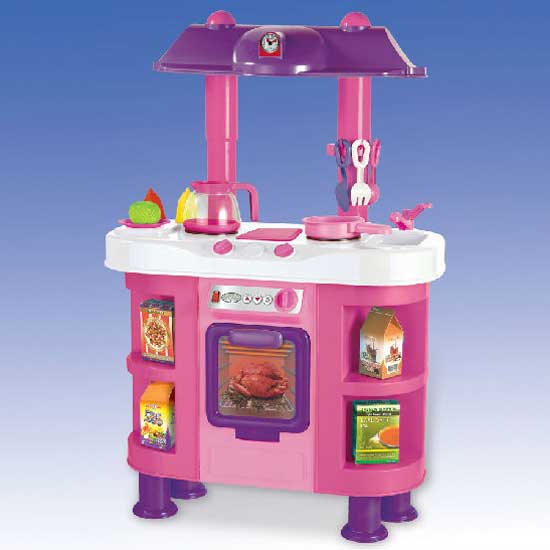 Displayed is a toy kitchen set that comes in a lovely pink color. With a realistic design, this toy kitchen set includes accessories like toy ingredients and utensils. This toy kitchen set is made of high quality materials for durability.