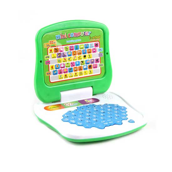 This is a toy laptop in a compact size that is designed with assorted images on the inside of the cover. It features a bright green housing which is printed with cute cartoon patterns on the exterior. This mini toy laptop is an ideal educational toy for little children.