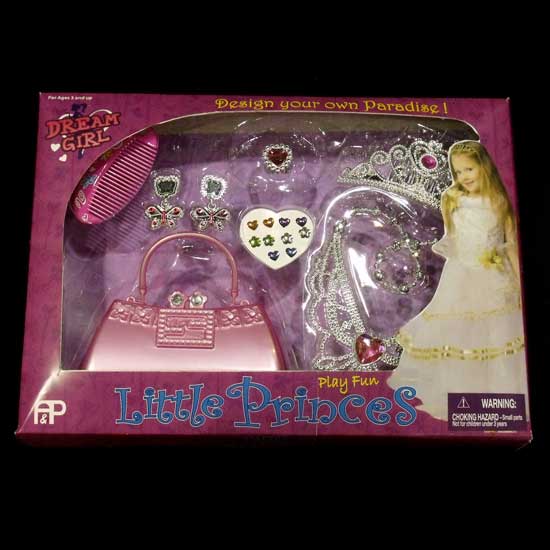 Available here is a toy make-up set designed for young girls. The set includes a comb, a mirror, a mobile phone, a handbag, a bracelet, a ring, a hairclip and a lipstick. Dress your girl into a little princess with this fun set.