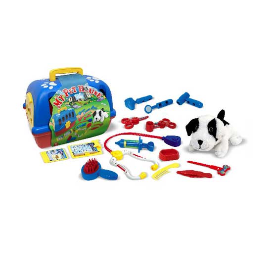 Displayed is a toy pet house that comes with a toy puppy. The accessories include combs, a syringe, a water bowl, etc. This fun toy pet house can give your child the experience of having a pet.