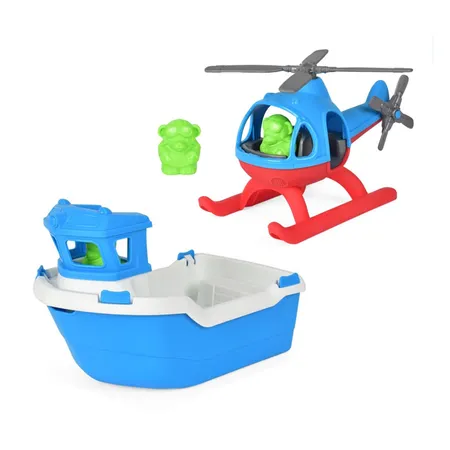 This kids’ toy set includes a plastic rescue boat and a helicopter in a cute design. The toy helicopter has two landing skids and is equipped with a main rotor and a tail rotor. The boat can float on water and is excellent for using as a bath toy. Included with the sets is a small figure for placing inside the cabin of the boat and helicopter.