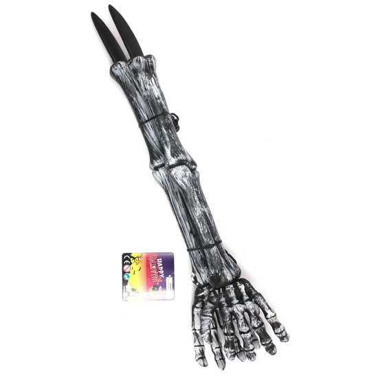 Shown here is a toy styled as a creepy ghost hand with two chains. Featured in vintage colors and a rustic finish, the skeleton-like hand is very realistic and appealing in appearance. The toy makes a superb accessory a cool decoration for Halloween.