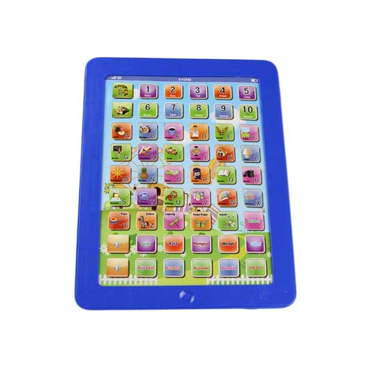 This is a toy tablet with a bright blue housing. It features a beautiful cartoon background in bright colors. This tablet is designed with English letters, English words and animal patterns for children to learn from.