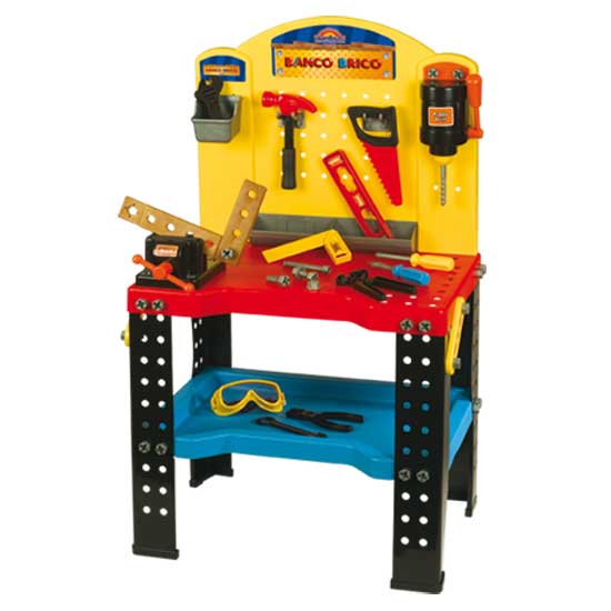Displayed here is a toy tool playset that comes with a set of tools. This toy tool playset includes a working table, a hammer, a pair of goggles, screws, etc. Let children experience the fun of being a workman with this refined toy tool playset.