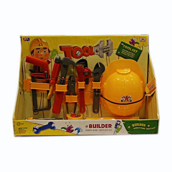 Featured is a toy tool set designed for children. It comes in a beautiful display box with various toy tools to teach children about engineering. This toy tool set is made of 100% toxic-free material to guarantee safe use.
