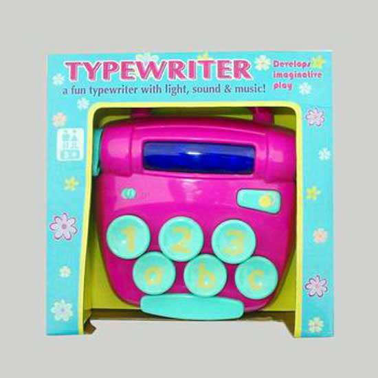 Highlighted is a toy typewriter designed in sharp teal and pink. The buttons come in an extra large size, allowing children to easily play with it. This typewriter features light, sound and music to appeal to children.