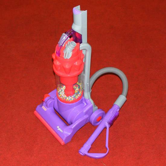 The featured item is a toy vacuum cleaner operated by batteries. When switched on, there will be suction at the purple vacuum head.