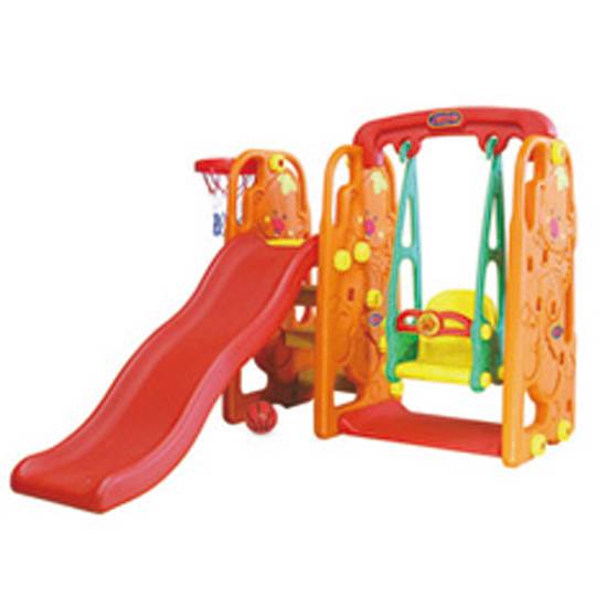 This is a set of toy slide and swing with BungBung animal patterns. This set is designed in a combination of red, orange,yellow and green colour. A basketball play set with a basketball is included.