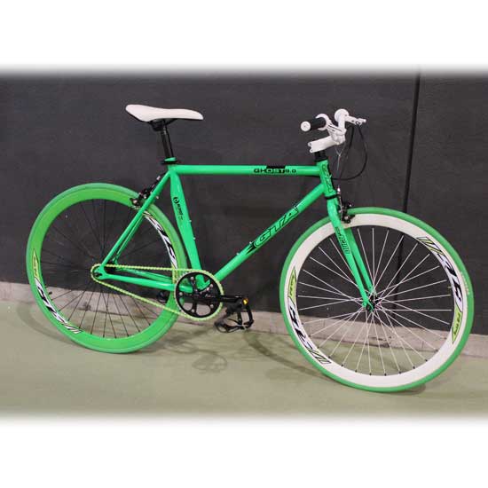 This stylish track bicycle features a green steel frame with a white seat and handle bar. The stylish track bicycle is adorned with self-adhesive decals for added appeal. The durable Wanda 700 x 25c tires can withstand daily wear.