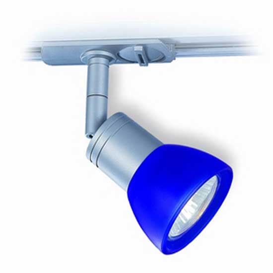 Featured is a track lighting system with an adjustable lamp head for the desired angle. The vivid blue framing adds a touch of style. LED and halogen light sources are available for your option.