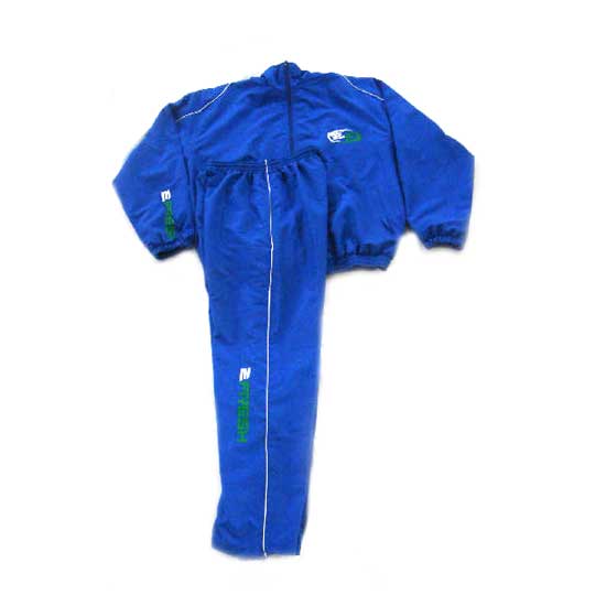 This is a set of track suit featuring a pair of straight-leg pants and a long sleeve jacket with a front zipper closure. The track suit is designed in bright blue allover and decorated with white lines and logos. With a soft and comfortable touch, this track suit is an ideal choice for athletic use.