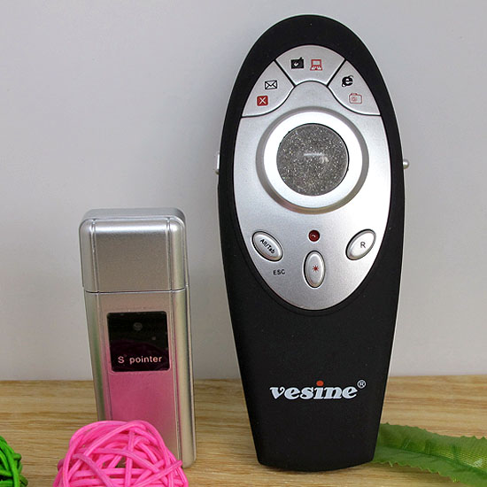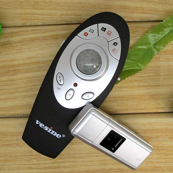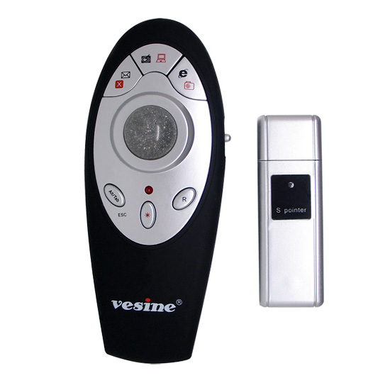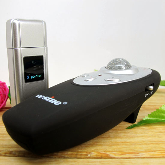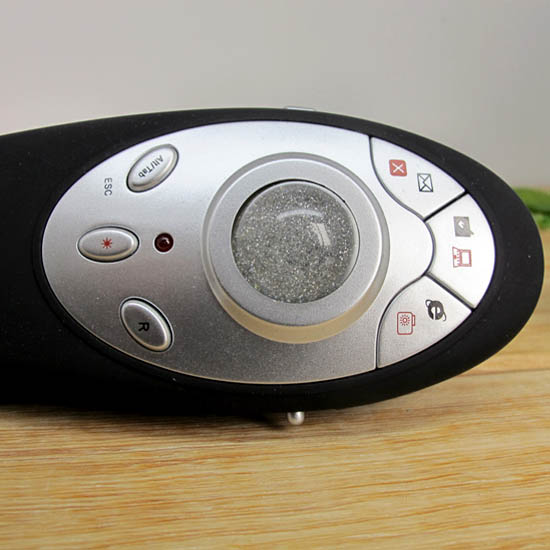 Shown is the presenter control with a trackball mouse. This black presenter comes with a silver color control panel and a glittery track-ball in the middle. Featuring quick email button, ALT, Tab controls and quick access to desktop/my computer button, this black presenter controller is unique and convenient. Enjoy a smoother presentation process by utilizing this handy trackball presenter.