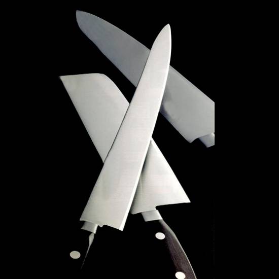 As shown are traditional Japanese knives with the edges by the traditional sharpening. The knives are suitable for cutting a great variety of food such as meat, vegetables, fruits, etc. The blades of these knives are of different shapes to cater different needs.