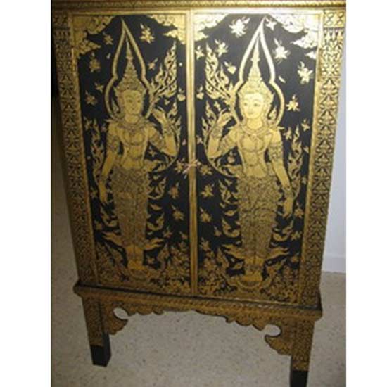 You are looking at an excellent sculpted and painted cabinet that flaunts a classical style. This fine cabinet is skillfully crafted with traditional Thai craftsmanship, showcasing a touch of exotic beauty. This is simply a fitting addition to stylish households.