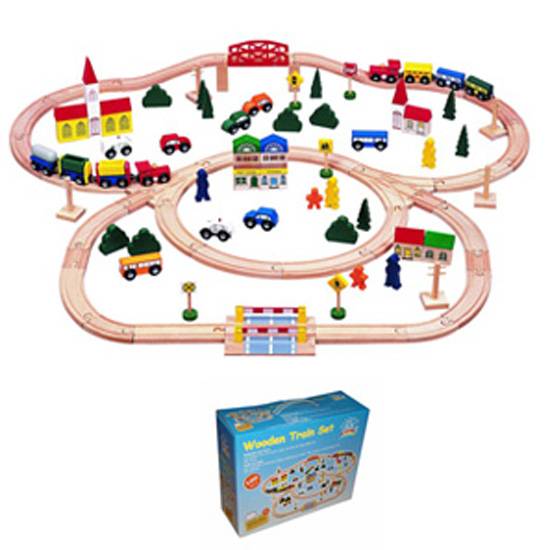 This is a set of wooden trains and tracks. The set also includes other small items such as trees, bus stops, churches and houses. Two kinds of timber, which are rubber wood and beechwood, are available.