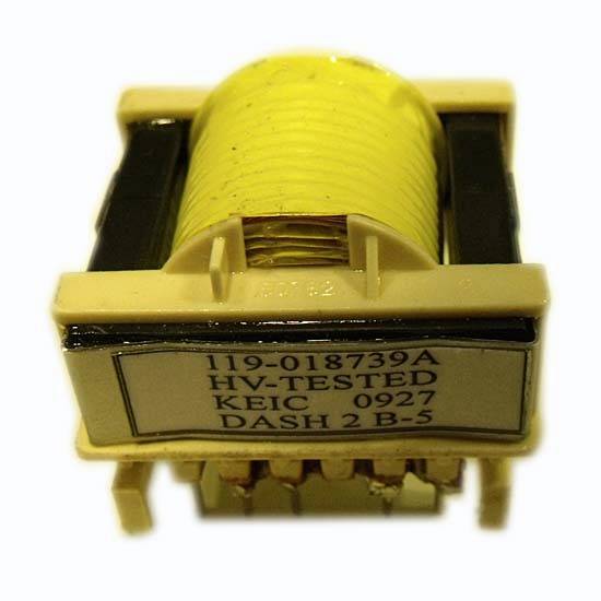 The transformer features a sturdy construction made of coils of copper wire and an insulated frame. The solder pins at the bottom are designed for PCB mounting. This high-efficiency transformer is suitable for various electrical applications.