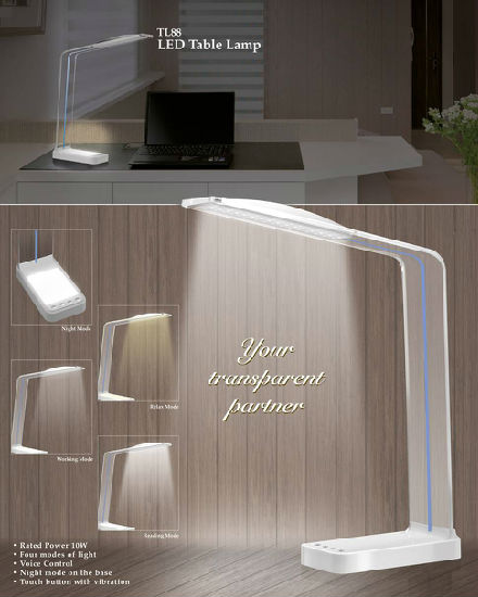 - Transparent designed LED lamp - 4 stage of brighness with different color temperature - 4 different modes (working, reading, relax and night modes) - Max Power output 8W - Night light on the base - touch button with vibration - stylish design