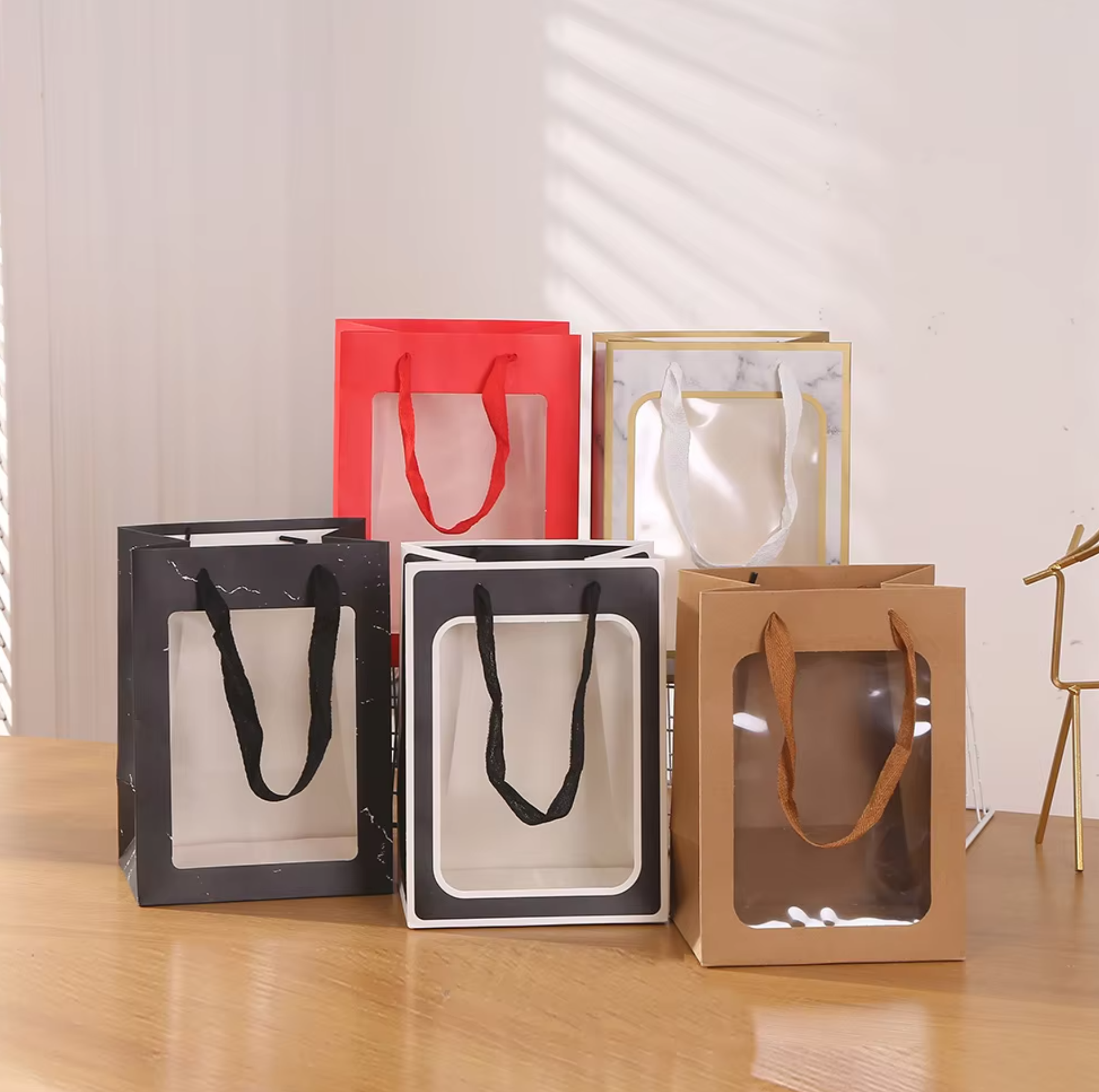 Transparent Logo Rectangular Window Gift Bag Handmade Kraft Paper Ribbon for Clothing Craft Candle Food Packaging