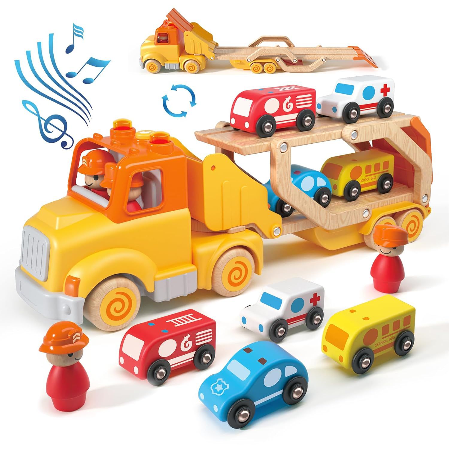 5-in-1 Transport Trailer: The truck set includes 1 large transport truck and 4 mini cars. The truck's cab is detachable, and the body can unfold into a 24in slide. This is a fun toy set for your child that not only provides enjoyment but also develops their fine motor skills.