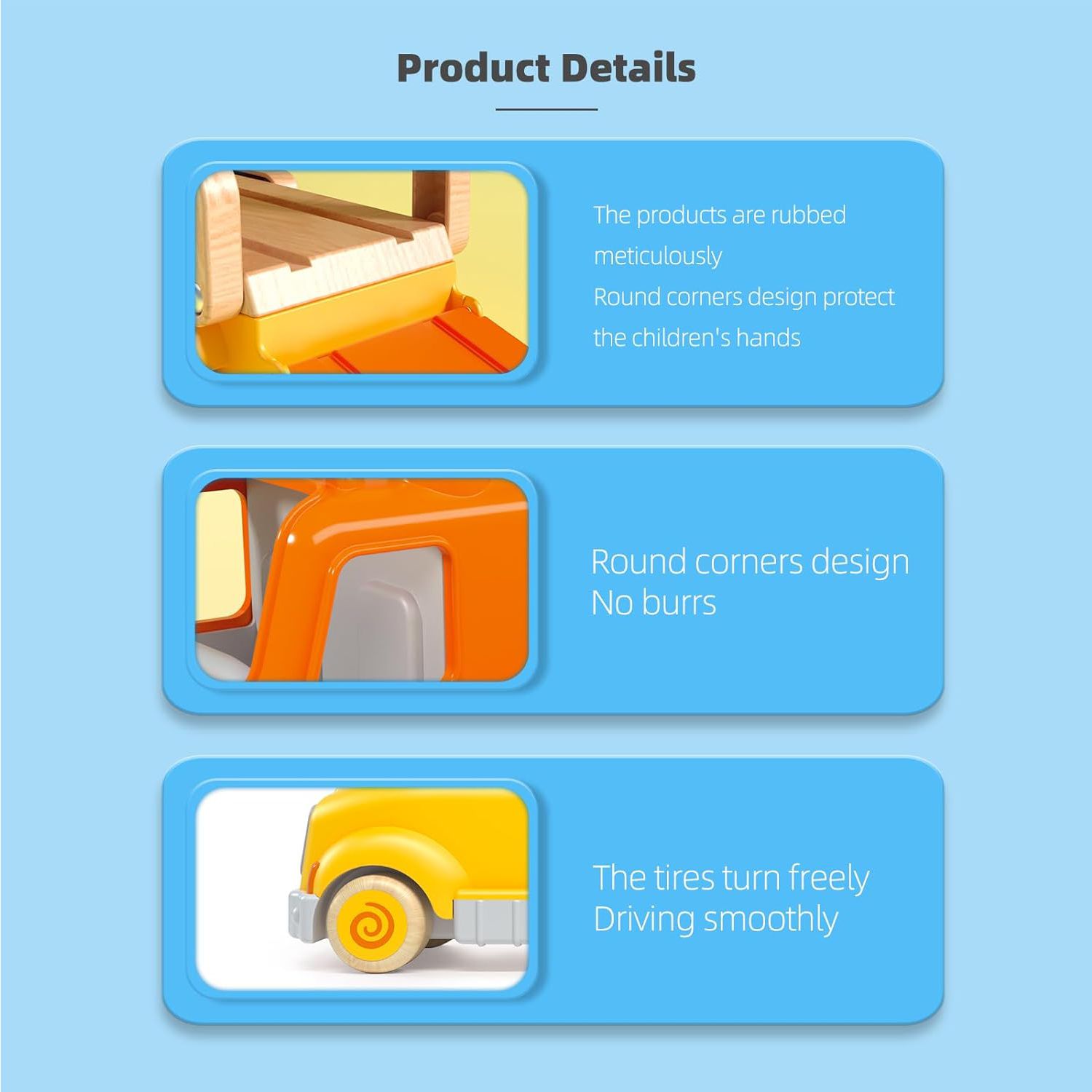 Safe Materials: The vehicles are made of sturdy beechwood and non-toxic, BPA-free ABS materials. They are coated with eco-friendly water-based paint, ensuring a smooth surface that won't harm your baby's sensitive skin. The smooth wooden wheels also won't damage your floors.