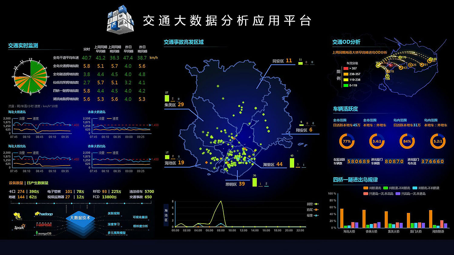 A platform based on highly available big data distributed structure, using new information technology such as GNSS/GPS, IOT, mobile Internet ,cloud computing, and AI, fully integrating traffic data resources, providing Transportation Big Data Analysis Application for government, enterprises and the public in the fields of traffic situation, traffic control, traffic evacuation, commercial vehicles, transportation credit and intercity traffic.