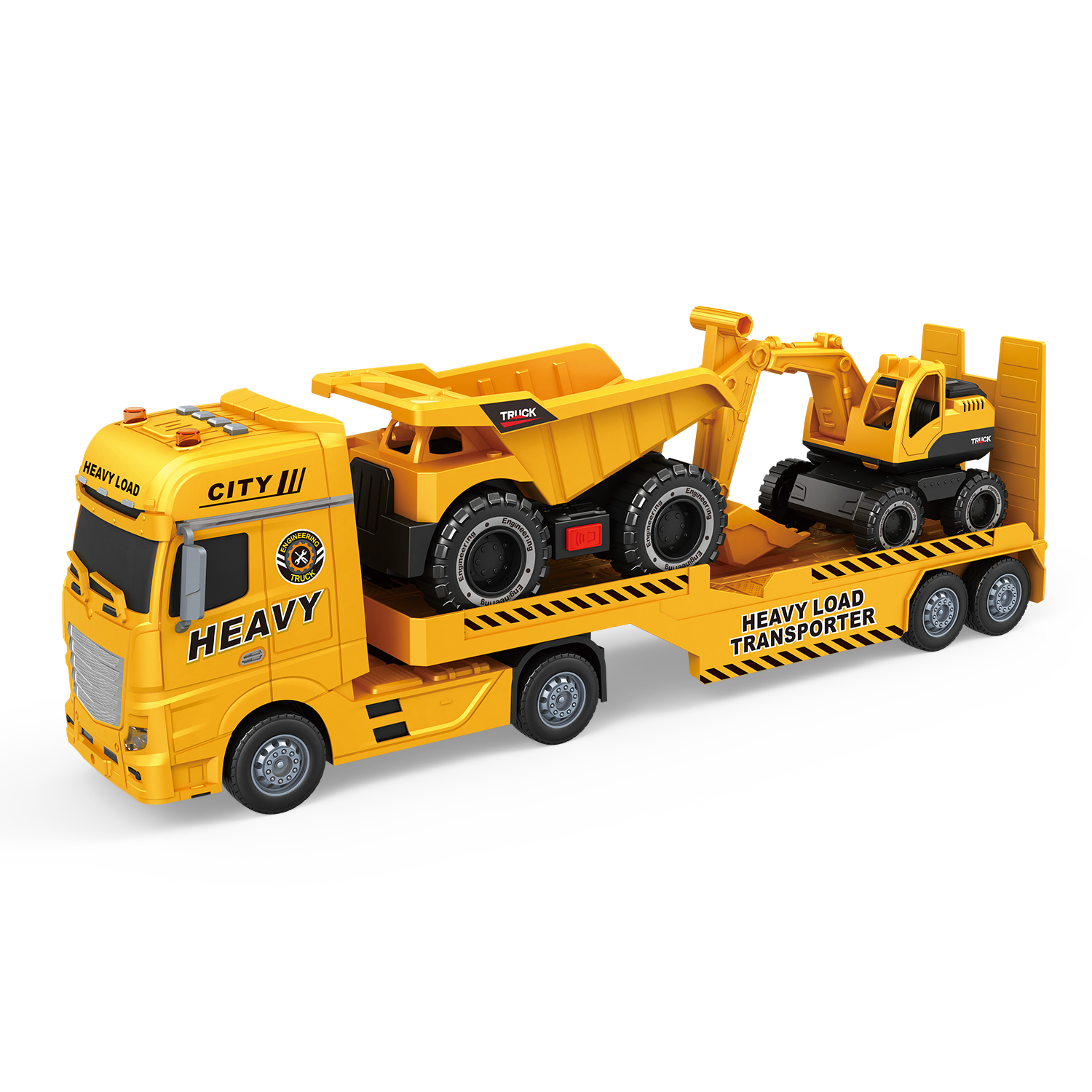 This transporter toy set replicates the functionality and appeal of a real-life transporter, complete with a robust heavy load transporter lorry and an additional truck on its flatbed. The plastic toy set boasts a meticulously detailed exterior, capturing the authentic look of a full-size transporter. Equipped with integrated light and sound effects, this transporter toy set can simulate the operation of a real heavy load transporter, bringing the child's imaginative play to life with vibrant lights and realistic sounds.