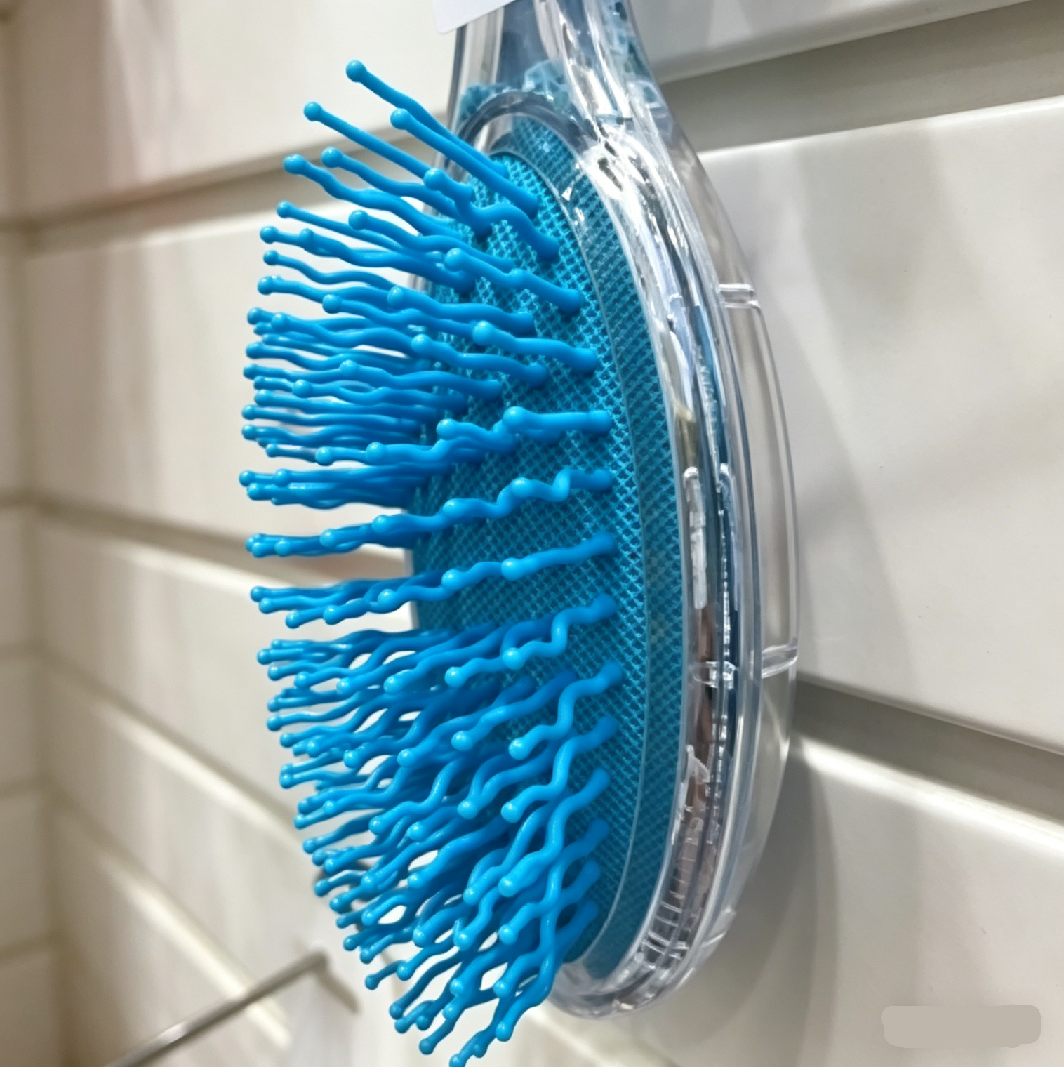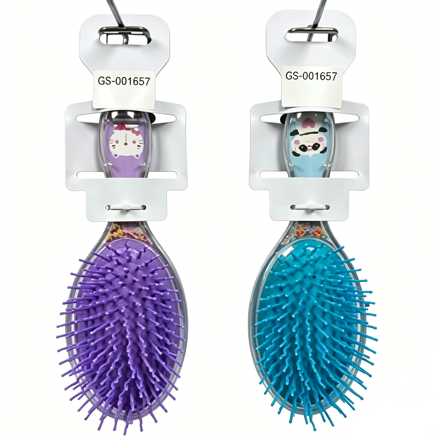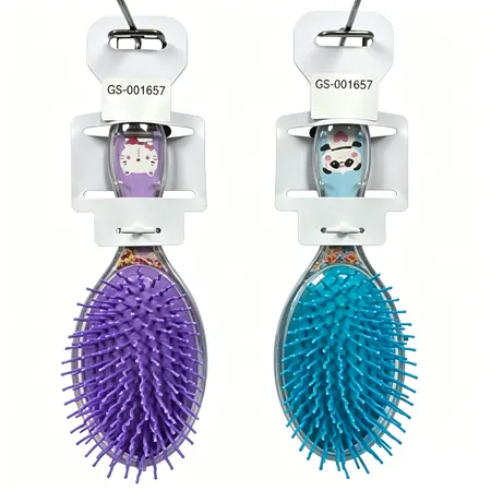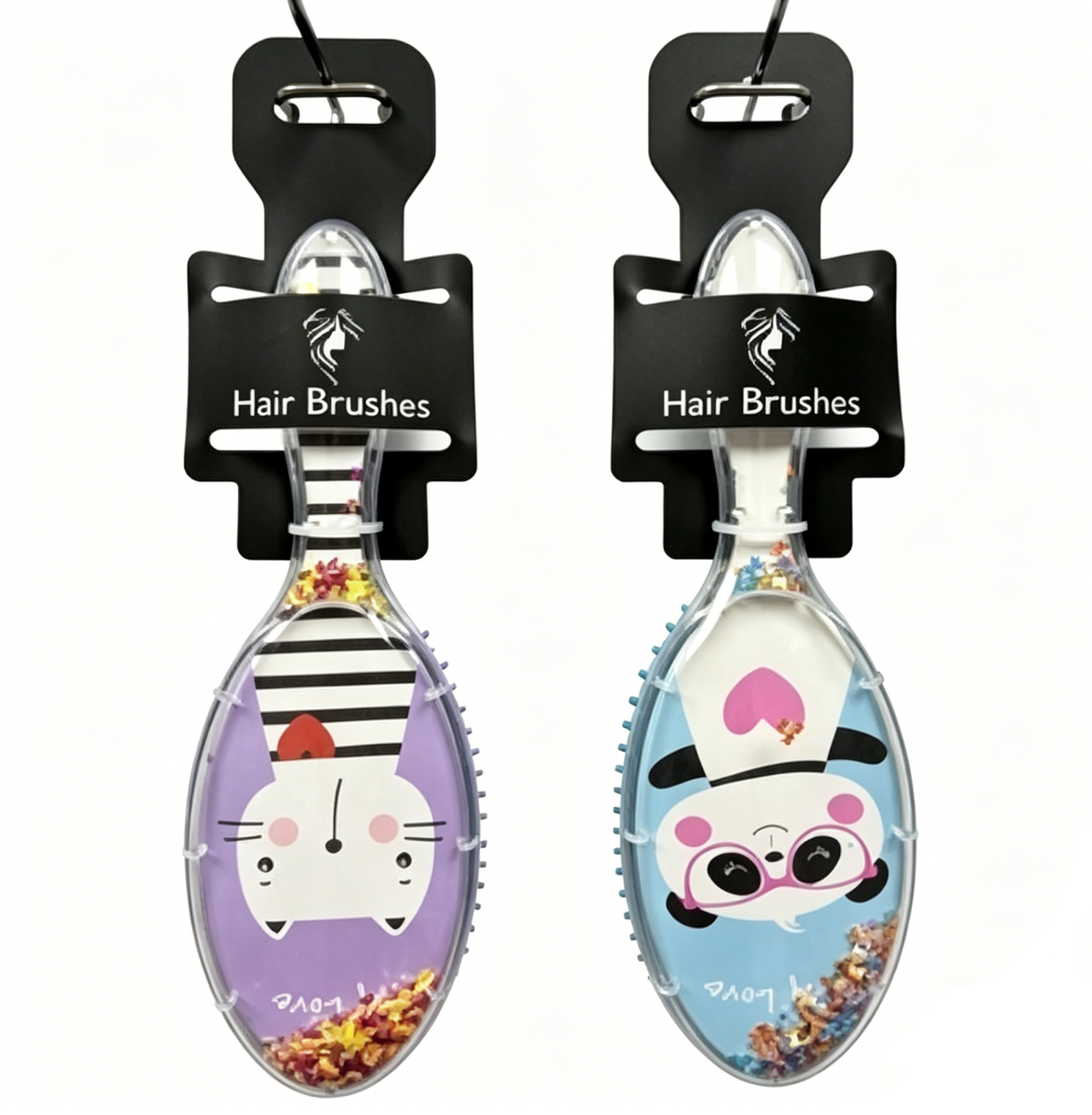 Trasparent plastic fancy hair brushes w/cartoon printed paper+glitter inside,color rubber cushion and nylon pins,wave shape pins