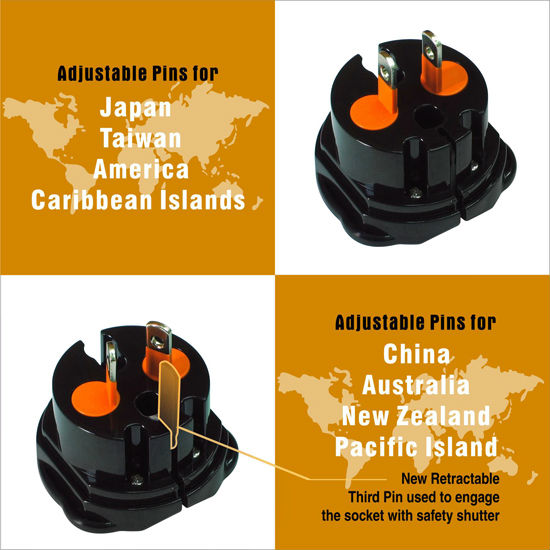 • Adjustable prong sets for US, Japan, Taiwan, Caribbean Islands, Australia, New Zealand, China and Pacific Islands.